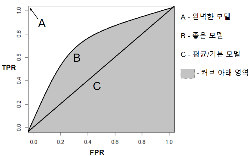 그렇다면 ROC곡선은 어떻게 모델의 성능을 반영할까? 모델이 완벽할 경우, FPR이 0이면서 TPR은 1일 것이다. 이 같은 경우, ROC곡선은 y=1 형태의 그래프를 띌 것이다. 모델의 성능이 좋은 경우, FPR을 낮게 유지하면서도, 높은 TPR을 유지할 수 있고, TPR을 높게 유지하면서, 낮은 FPR을 유지할 수 있다.이 경우 B와 같은 그래프의 형식을 띌 것이다.
