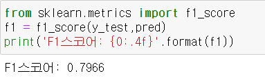 사이킷런은 F1 score를 구하기 위한 f1_score()메서드를 제공한다.