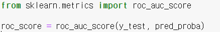 사이킷런은 ROC곡선의 AUC를 구하기 위해 roc_auc_score()메서드를 제공한다. roc_curve()와 동일하게 인자를 입력하고 auc값을 반환한다.