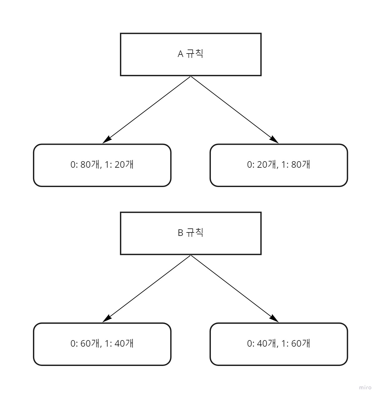결정트리는 균일도가 높은 데이터셋으로 분류할 수 있도록 규칙 노드를 생성한다. 그림과 같이 A규칙을 이용하면 0이 80%, 1이20%인 데이터셋과 0이 20%, 1이 80%인 데이터 셋으로 분류할 수 있다고 가정하고, B규칙을 이용하면 0이 60%, 1이 40%인 데이터셋과 0이 40%, 1이 60%인 데이터셋으로 나눌 수 있다고 가정하자. 좋은 분류기를 만들기 위해서는 어떤 규칙을 사용해야 할까? 당연히 A규칙이 두 label을 더 잘 분류하고 있으므로 A규칙을 사용해야 한다. 즉, A규칙으로 분류한 두 데이터셋의 균일도가 B규칙을 이용한 것보다 높으므로 A규칙을 사용한다고 얘기할 수 있다.