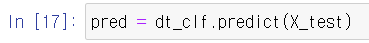 X_train을 이용하여 학습을 진행했으므로 예측하는 함수인 predict()를 사용할 경우 X_test를 이용해야 한다. 다음 라인을 진행하면 pred에는 X_test에 대응하는 y_test값을 예측하여 Series형태로 저장하게 된다. 이는 이후에 accuracy_score()와 같은 함수에서 정확도를 계산하는데 사용된다.