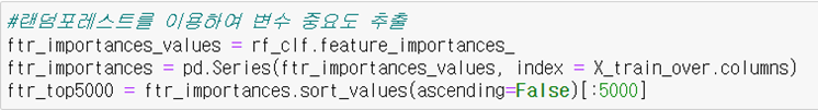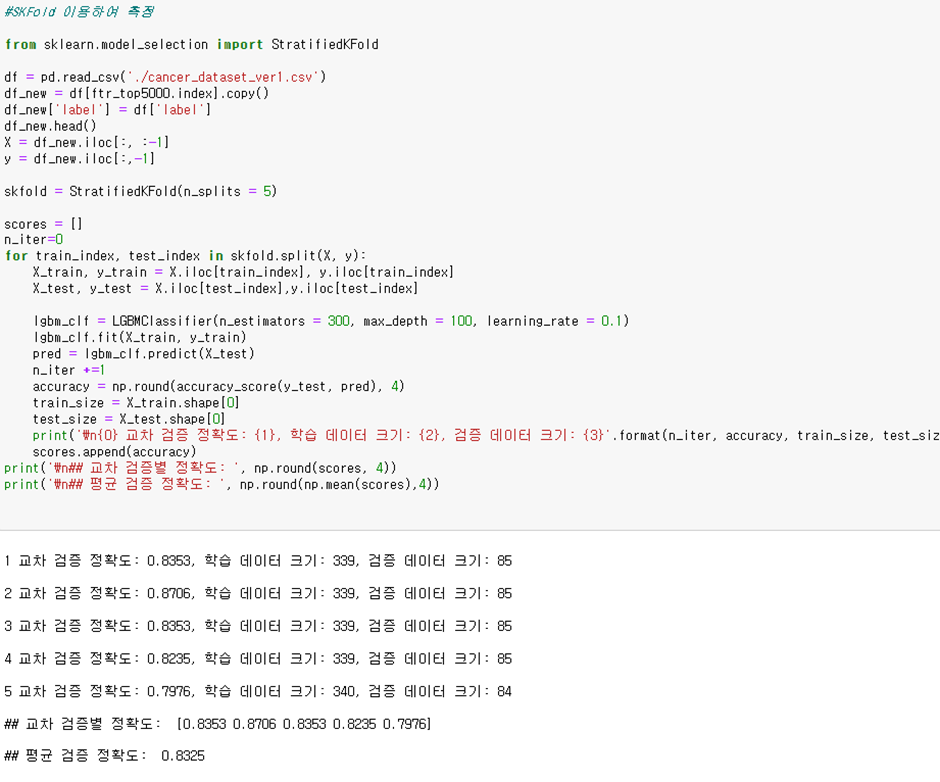 앞서 랜덤 포레스트 모델에 사용한 데이터셋은 column이 약20000개로 매우 많았다. 따라서 feature importance 산출을 통해 중요 변수 5000개만을 이용하여 데이터셋을 재정의하였다. 마찬가지로 오버샘플링 등 필요 전처리를 수행한 후 LightGBM모델을 이용하여 학습하였다. 결정트리의 개수는 500, 학습률은 0.1, 최대 깊이는 100으로 설정하였으며, 100개의 트리를 생성하는동안 성능이 개선되지 않았다면 조기 종료할 수 있도록 코드를 작성하였다. 그 그 결과 정확도는 82.35%가 산출되었다.