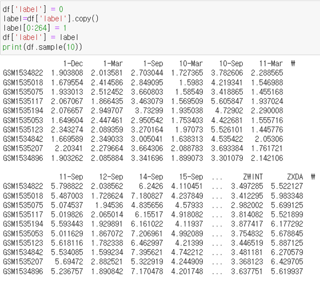 다음으로 레이블을 붙이는 작업을 수행했다. 해당 데이터를 다운받은 NCBI에서 몇 번째까지 환자의 데이터이고, 일반인의 데이터인지 확인한 후 환자의 경우 1 일반인의 경우 0으로 레이블링 하였다. 그 이후 데이터를 다시 확인해 본 결과 column명이 유전자가 아닌 날짜로 되어있는 column이 확인되었다. 이는 해당 실험에서 기준으로 삼은 유전자의 발현량이 아니기 때문에 모든 날짜 column은 제거하였다.
