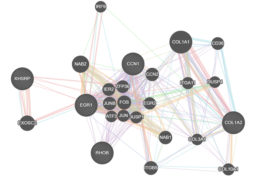 - 11715354_a_at: COL1A2 gene의 probe id이다. 단백질 코딩 유전자이다. COL1A2와 관련된 질환은 골형성 불완전, 유형 iii 및 골형성 불완전성, 유형 IV를 포함한다. 관련 경로 중에는 ERK의 Integrin Pathway 및 Development Angiotensin 활성화가 있다.