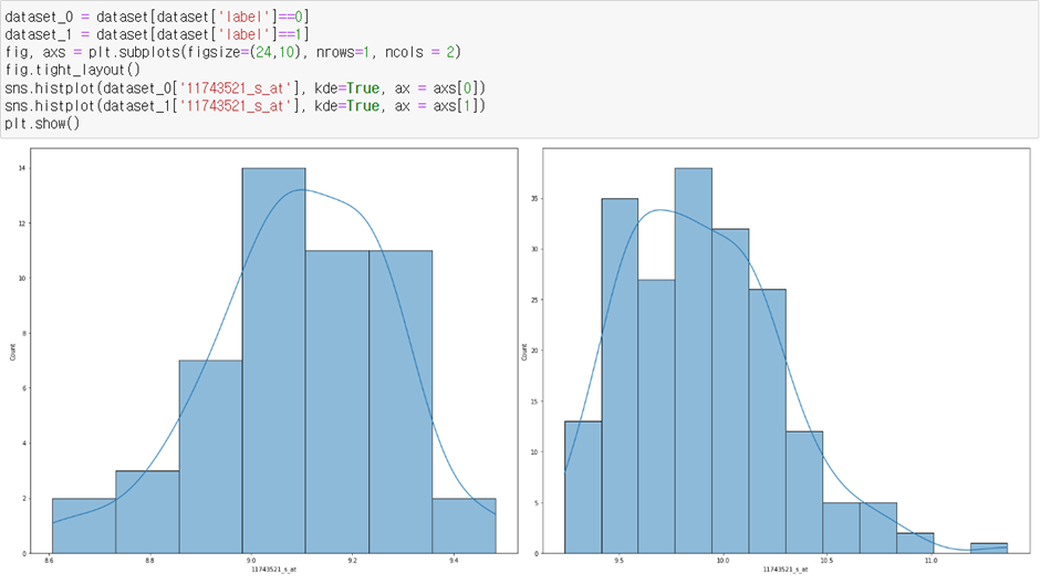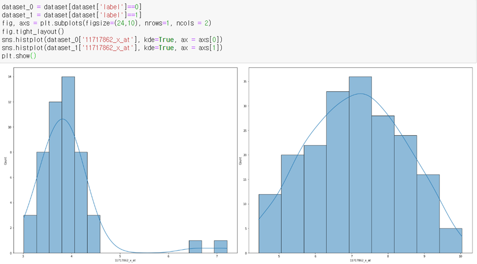 유전자 ‘11743521_s_at’의 환자에서의 발현량과 일반인에서의 발현량을 비교해보았다. x축은 유전자 ‘11743521_s_at’이고 y축은 데이터의 개수이다. 왼쪽이 레이블이 0, 즉 일반인의 발현량 분포이고, 오른쪽이 1, 즉 환자의 발현량 분포 그래프이다. 일반인 발현량 그래프의 경우 약 9.1의 평균값을 가지고, 최소 8.6, 최대9.5 정도의 값을 가지는 정규분포 형태의 그래프이고, 오른쪽은 약 9.7의 평균값을 가지고, 최소 9.3 최대 11.5 정도의 값을 가지는 정규분포 형태의 그래프이다. 평균값이 크게 차이를 보이고, 일반인이 환자에 비해 적은 발현량을 가지는 것을 확인할 수 있다. 또한 일반인의 발현량 최대값이 환자 발현량 최소값과 거의 비슷한 것으로 보아 두 데이터의 분포는 거의 겹치는 부분이 없는 것을 확인할 수 있었다.