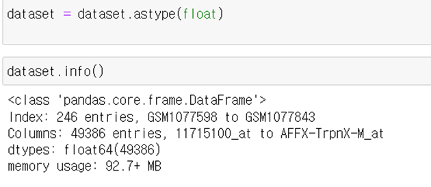NCBI에서 다운받은 데이터는 기본적으로 행 열이 뒤바뀌어 있고 학습에 필요 없는 환자 ID가 존재한다. 따라서 이를 처리해주는 작업을 이전과 같이 진행해 주었다.