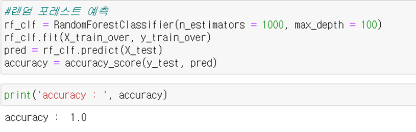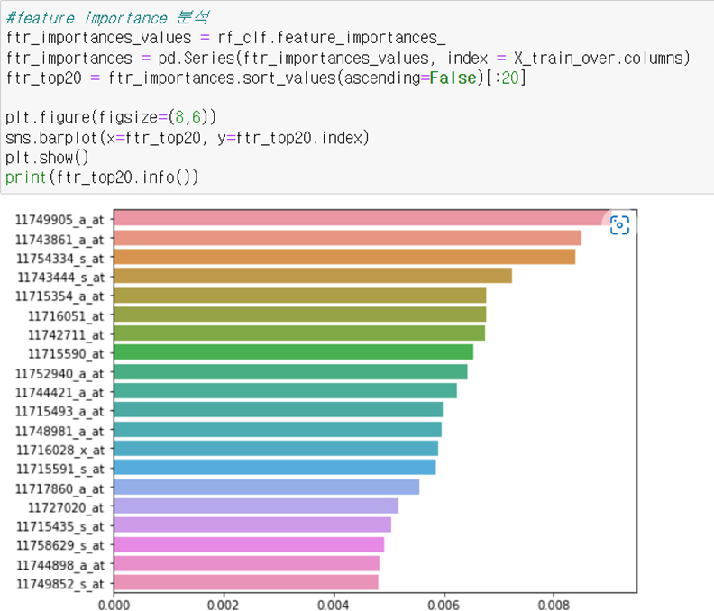 다음으로 랜덤 포레스트 모델을 이용하여 정확도를 테스트해 보았다. 결정 트리 개수는 1000개, 최대 깊이는 100으로 설정하였다. 정확도는 100%가 나왔다. 물론 테스트 셋의 개수가 적은 편이기 때문에 값이 튈 수도 있지만, 이전 실험에 비해 훨씬 높은 정확도가 산출되었기 때문에 어떤 이유로 다음과 같은 결과가 산출된 것인지 확인하기 위해 feature importance 그래프와 변수 histplot을 그려보았다.