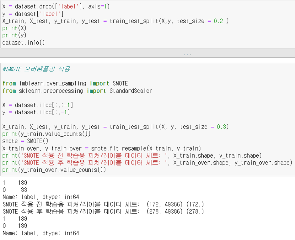 학습셋과 테스트셋으로 나눈 후 오버 샘플링을 진행하였다. 기존 학습셋에는 환자데이터 139, 일반인 데이터 33개 존재했고, 오버 샘플링 이후 두 레이블 모두 139로 동일하게 바뀐 것을 확인할 수 있다.