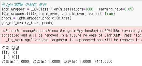 최종적으로 성능이 뛰어난 분류기를 만들기 위해서 LightGBM을 이용하였다. 결정 트리의 개수는 1000개, 학습률 0.05로 설정하였다. 결과는 모든 테스트셋을 정확하게 맞추어 정확도 100%가 산출되었다. 물론 테스트셋의 수량이 적기 때문에 값이 튈 수 있지만 랜덤 포레스트 모델보다 좋은 결과를 나타낸 것을 확인할 수 있었고, 실제 진단이 필요한 상황에서 임시로 테스트할 수 있을 정도의 성능을 나타냈다.