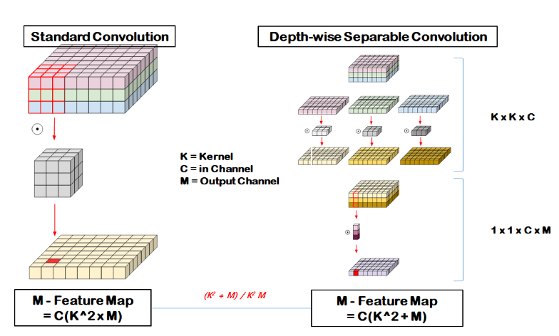 위의 그림의 Standard Convolution을 보면 M개의 feature map을 생성하기 위해 필요한 parameter의 수는 kernel size k * k와 input channel 수 C, feature map의 개수 M을 모두 곱한 값이 된다. Depth-wise Separable Convolution의 경우 우선 3channels feature map을 만들어내는 데 필요한 parameter의 개수는 kernel size k * k에 in channels C를 곱해 C * k * k 이고, 두 번째 단계로 원하는 feature map의 개수만큼 1 * 1 convolution을 진행하는 부분에서는 kernel size 1 * 1에 in channels C, output feature map의 channel 수인 M을 곱해 총 C * M개의 parameter가 사용된다.