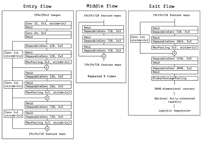 - Residual Connection으로 연결된 Xception 모듈을 3번 사용하여 19 * 19 * 728의 feature map을 생성한다.