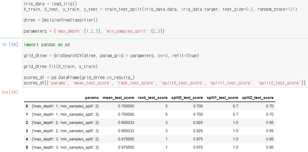 - param_grid: 딕셔너리 형태의 데이터를 입력받으며, estimator의 튜닝에 사용될 하이퍼 파라미터와 그 값들을 지정한다(결정트리에서는 max_depth, min_samples_split등이 있음).