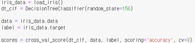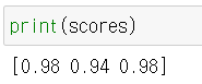 scores에는 각 시행의 결과를 리스트 형태로 저장한다. cv=3이었으므로 총 3개의 정확도 값이 저장된 리스트를 반환한다.