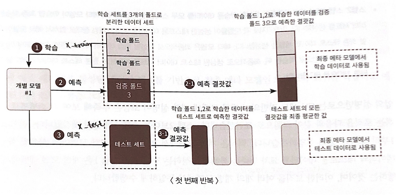 왼쪽 그림은 스태킹 모델의 전체적인 구조이고 오른쪽 그림은 CV(cross validation) 기반의 스태킹에서 각각의 개별 모델의 구조를 그림으로 나타낸 것이다. 오른쪽 그림을 자세히 보자. 개별 모델은 학습 데이터를 교차 검증을 이용하여 학습한다 이때 각각의 반복에서 검증 폴드를 예측하고 이를 모두 취합하면 학습데이터 크기의 예측 값 데이터가 생성된다. 이는 최종예측 모델이 학습하게 될 학습데이터로 사용된다. 또한 개별 모델이 테스트 데이터를 이용하여 예측한 결과값은 최종 예측 모델의 테스트 데이터셋으로 사용된다.