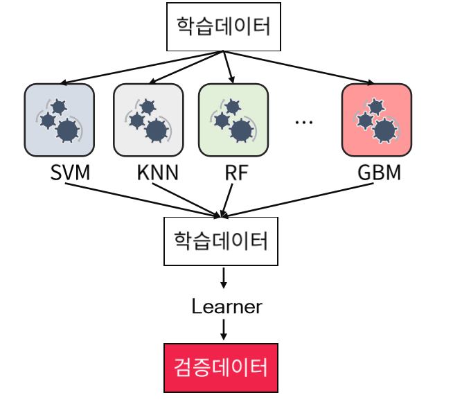 왼쪽 그림이 보팅, 오른쪽 그림이 스태킹이다. 보팅은 학습데이터를 이용해 개별 모델들을 학습하고, 학습된 모델들을 기반으로 검증데이터의 label을 예측하여 예측결과를 합산하는 방식이다. 스태킹은 반면, 학습데이터를 이용하여 개별 모델을 학습하고, 학습 과정 중에 예측했던 개별 모델의 예측값을 모두 취합하여 최종 예측 모델의 학습 데이터로 이용된다. 최종 예측모델은 이렇게 생성된 학습 데이터를 기반으로 학습하고, 검증데이터의 label을 예측한다.