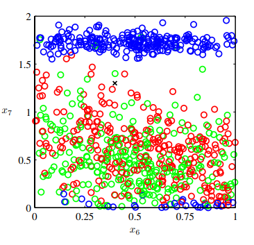 언뜻 보면 꽤나 타당한 분류 방법인 것 같으나 이 분류법의 문제는 입력 공간이 커짐에 따라 발생한다. 현재는 두 개의 입력공간 x6, x7을 바탕으로 산포도를 표현하였지만 사실 이 예시에는 x1, x2, x3 등 더 많은 입력공간이 존재한다. 위의 산포도에서는 단지 다른 입력공간을 모두 생략하고 x6, x7만 고려하여 나타낸 것이다. 여기서 만약 차원이 하나 더 추가된다면 어떻게 될까?