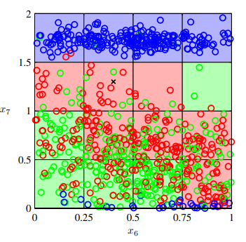 위의 그래프를 통해 고차원 공간의 입력 변수를 다루는 문제를 살펴보자. 그림에서 x점을 추정하기 위해 어떤 알고리즘을 사용할 수 있을까? 가장 간단하게 전체를 균일한 영역으로 나누고 각각의 영역에서 가장 많은 수를 나타내는 label 값을 그 영역의 label로 결정하는 것이다.