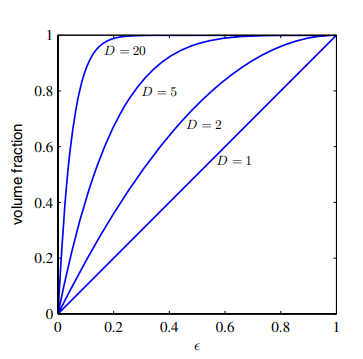 우리가 3차원 세계에 살면서 얻게 된 기하학적 직관은 고차원에서 매우 다르게 작용할 수 있다. 간단한 예로 D차원의 반지름 r=1인 구체를 고려해 보자. 만약 반지름 r = 1−e에서 r=1 사이에 존재하는 부피의 비율을 계산한다면 어떻게 될까? D차원에서 반지름 r을 가지 ㄴ구체의 부피는 r^D에 비례하여 증가한다. 따라서 다음과 같이 적을 수 있다.