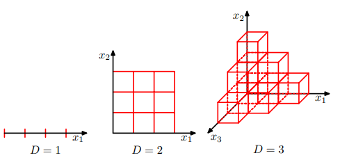 위의 그림을 보면 입력 공간이 하나씩 추가될 때 마다 나눠야 하는 영역의 개수를 보여준다. 입력 공간이 하나일 경우 총 3개의 영역으로 나누었다. 만약 입력 공간이 하나 추가되면 영역은 9개로 늘어난다. 즉, N차원에서는 3^N개의 영역으로 나누어야 한다는 것이다. 이는 입력 변수가 추가될 때마다, 생성해야 하는 영역의 수가 늘어나는 속도가 너무 빠르다. 조금민 고차원으로 올라도 기하급수적으로 증가하는 것이다. 그리고 영역이 늘어남에 따라 각 영역을 채우는 데이터 포인트의 수도 비례하여 늘어나야 한다. 따라서 이러한 접근법은 고차원에서 타당하지 않음을 알 수 있다.