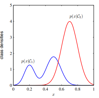 위의 그림을 통해 생성 모델의 특징을 알아보자. 생성 모델은 추론 과정에서 가능도에 해당하는 p(x|Ck)를 모델링하게 된다. 따라서 위의 그래프와 같은 모델이 만들어지는데, 사실 분류 문제에서는 위의 그림에서 붉은 그래프와 파란 그래프가 교차하는 지점 즉, 결정 경계를 찾아내는 것 만이 중요하다. 그 이외의 정보들은 필요가 없는데, 사실 이러한 결정 경계를 찾기 위해서 가능도 함수를 모델링한다는 것은 꽤나 큰 자원의 낭비이다. 다른 방법을 통해서 더욱 쉽게 결정 경계를 찾을 수도 있기 때문이다. 그러나 단순히 분류 문제에 국한하였을 때 가능도 함수가 낭비이지만, 앞서 언급한 것 처럼 이상점 검출, 새로운 데이터 생성 등의 목적이 있을 경우, 이러한 과정이 꼭 필요하게 된다.