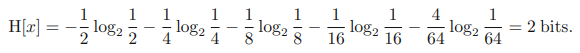 그런데 만약 똑같이 8개의 값을 가질 수 있는데 각각의 값을 가질 확률이 (1/2, 1/4, 1/8, 1/16, 1/64, 1/64, 1/64, 1/64)라고 해보자. 즉, 확률이 균일하지 않고 비균일 한 것이다. 이 경우 엔트로피는 다음과 같다.