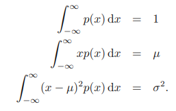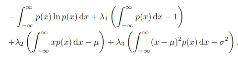 연속 변수에 대한 미분 엔트로피는 다음과 같이 주어지는 것을 알 수 있다. 이산 분포의 경우 확률 분포가 변수가 가능한 모든 상태에 대해 같은 확률을 가질 때(균일할 때) 최대인 것을 확인하였다. 연속 변수의 경우에는 어떨까? 다음 세 가지 제약조건을 통해 라그랑주 승수법을 이용하여 최댓값을 구할 수 있다.