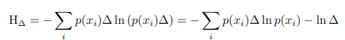 위와 같은 식을 통해 연속 변수를 이산 분포화 시킬 수 있다. 이 경우 해당 엔트로피는 다음 형태를 띈다.