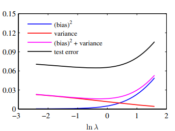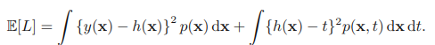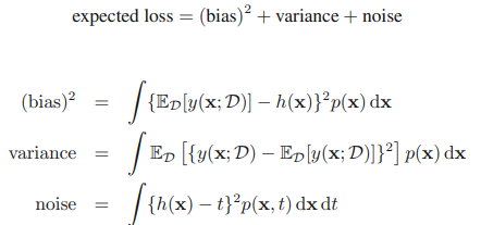 여기서 두 번째 항은 y(x)와 독립적으로, 데이터의 내재적 노이즈로부터 생겨난 것이며, 기대 오륫값이 도달할 수 있는 가장 최소의 값에 해당한다. 첫 번째 항의 값은 함수 y(x)로 어떤 것을 선택하느냐에 따라 결정된다. 우리 목표는 첫 번째 항의 값을 최소화하는 y(x)를 찾아내는 것이다. 여기서 데이터는 데이터 집합 D로 주어지고, D는 유한한 개수의 데이터 집합을 나타내게 된다.