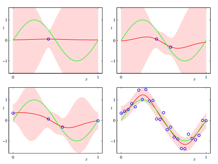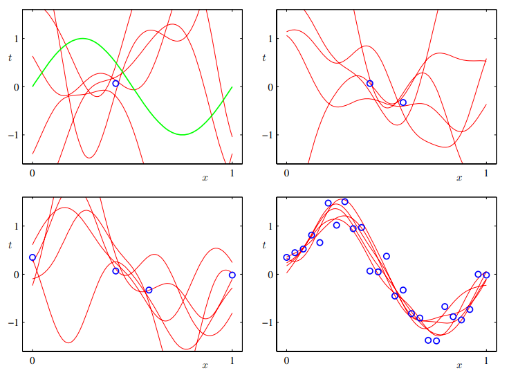 데이터 포인트 근처에서 분산이 작아지며, 관측 데이터가 추가됨에 따라 빨간색 음영 구간이 줄어드는 것을 확인할 수 있다. 이 그림은 x에 대한 함수 하나에 대해 나타내고 있다. 다양한 여러 개의 예측 함수를 그려보면 다음과 같다.