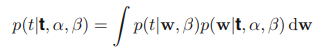 여기서는 w의 값을 알아내기 위해 학습을 반복했는데 실제 상황에서는 결국 새로운 x값에 대해 t의 값을 예측하는 것이 목표이다. 이를 위해서는 다음과 같이 정의되는 예측 분포(predictive distribution)를 고려해야 한다.