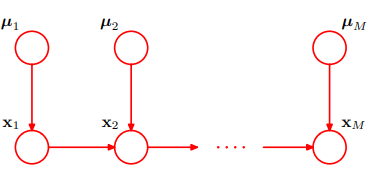 더 일반적인 경우를 고려해보자. M개의 이산 변수 x1, ... ,xM을 가정하자. 만약 그래프가완전 연결 되어있다면 매개변수는 앞서 살펴봤듯이 K^M - 1개의 매개변수를 가지게 된다. 반대로, 그래프의 링크가 하나도 없을 경우 M(K-1)개의 매개변수를 가진다. 추가로 연결 밀집도가 중간정도 되는 다음의 그래프를 생각해보자.
