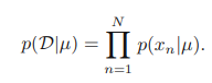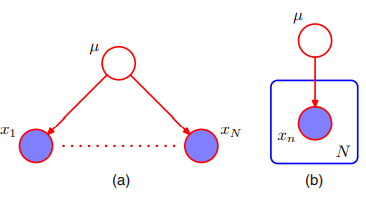 D = {x1, ... , xN}라고 하면 D집합의 원소는 관측된 µ에 대해 꼬리대 꼬리 노드이기 때문에 각각의 xi와 xj사이에 독립이라는 것을 알 수 있다. 따라서 독립의 성질을 이용하여 다음과 같이 적을 수 있다.