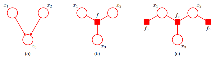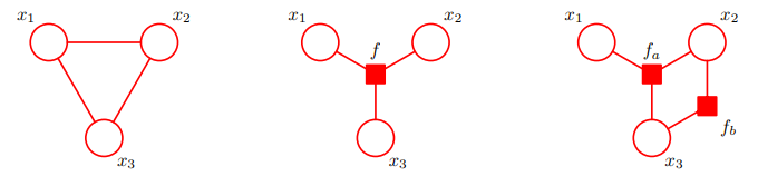 (b)는 x1, x2, x3사이의 관계를 한번에 나타낸 반면 (c)의 경우 더 구체적으로 인수분해하여 fa, fb, fc로 나타냈다. 이 경우 인자 그래프도 순환 구조를 가지게 된다. 많은 상황에서, 우리는 트리 구조를 원할 것이기 때문에 이러한 방식의 인수분해는 적절하지 않을 수 있다. 따라서 적절한 인자함수를 사용하여 순환 구조를 트리 구조로 변경하는 것이 그래프 추론 문제에서 중요하다.