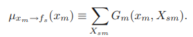 위의 그래프를 보자. fs와 연결된 변수 노드 xm을 계산하려고 보니 여기에 연결된 또다른 인자 노드들이 있고 이를 고려해야 한다. xm과 연결된 모든 인자 노드들의 곱은 Gm으로 표현하였다. 이는 식으로 다음과 같이 나타낼 수 있다.