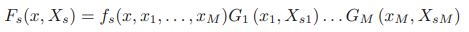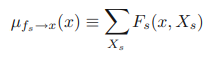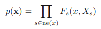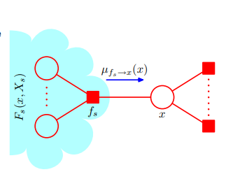 위의 그래프는 x를 중심으로 축약하여 나타낸 p(x)의 인자 그래프이다. x는 여러 인자들을 통해 다른 노드들과 연결되어 있다 그 중 하나의 인자인 fs를 고려하여 보자. fs는 x 뿐만 아니라 다른 여러 노드와 연결되어 있을 것이다. Xs는 fs를 통해 x와 연결되어 있는 모든 노드들을 지칭하며, Fs(x, Xs)는 fs와 연관된 그룹의 모든 인자들의 곱을 나타낸다. 이는 다음 식으로도 나타낼 수 있다.