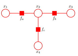다음과 같은 4개의 노드를 가진 인자 그래프를 고려해보자.