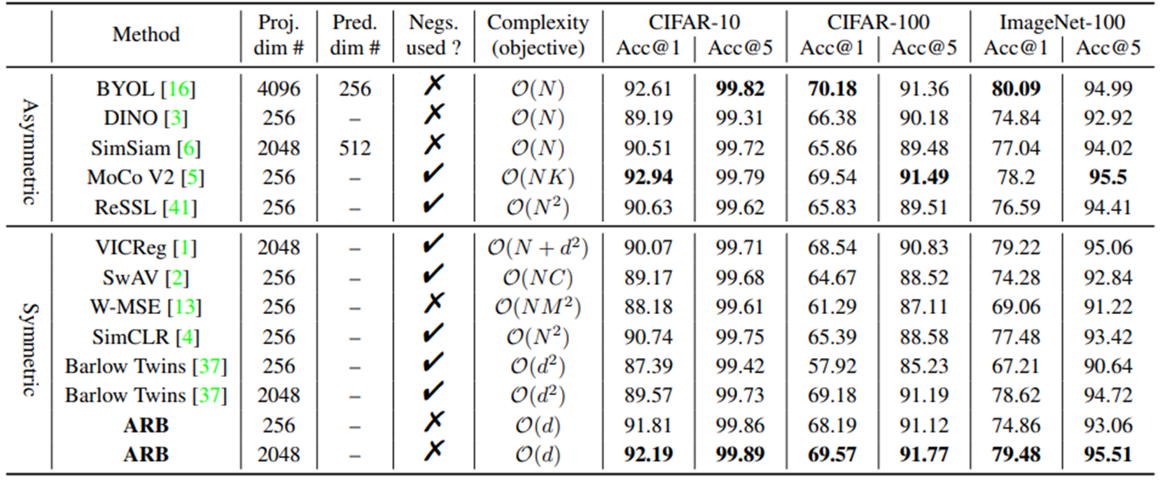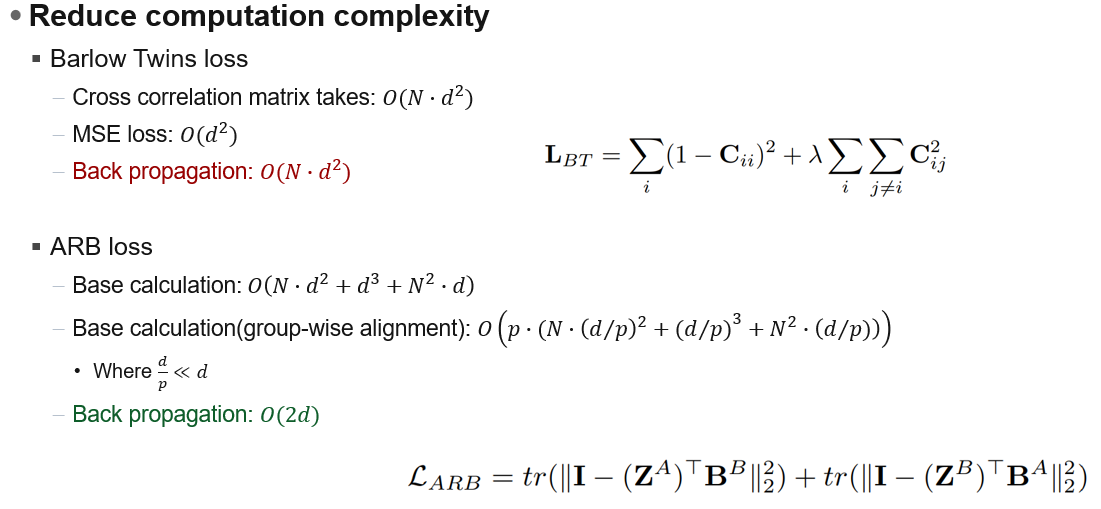 - 이 부분이 ARB의 핵심인데, 기존의 contrastive learning의 경우 Z^A와 Z^B가 서로 가까워지도록(positvie pairs) loss가 설계되었다면 ARB는 Z^A와 B^B 즉, Z^A와 Z^B의 가장 가까운 직교 벡터를 따라가도록 loss가 설계되었다는 것이다.