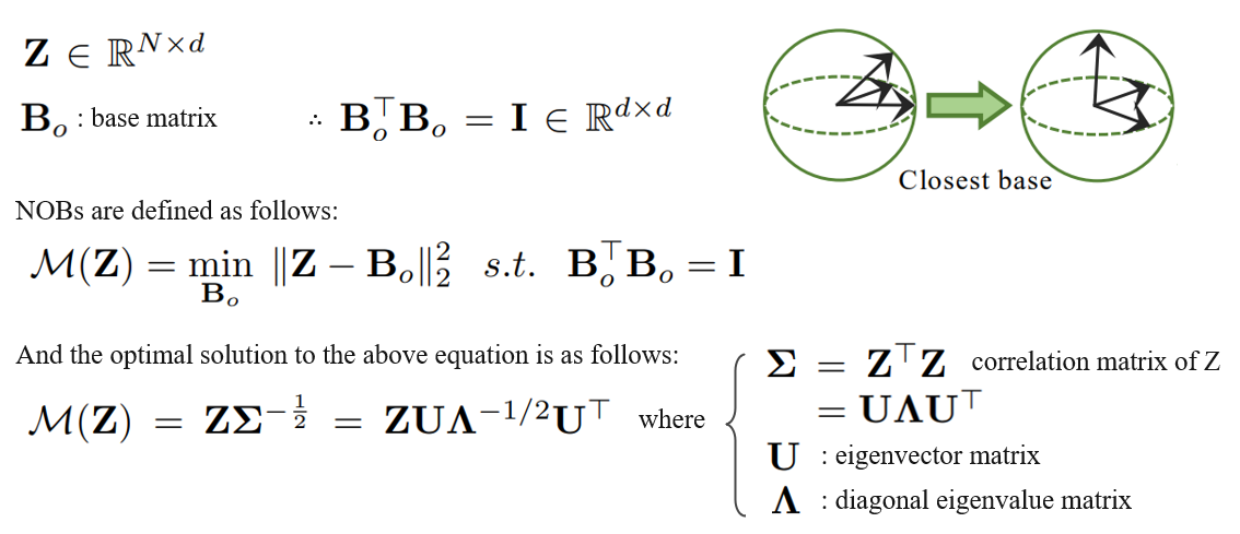 Z는 N의 batch size와 d의 feature vector dimension을 갖는 임베딩 batch이고, B0는 이러한 base matrix 즉, 모든 행 벡터들이 서로 내적값이 0이 되는 matrix이다(다시 말해 모든 행 벡터가 직교). 그렇다면 NOBs(Z에서 가장 가까운 base)는 다음 식과 같이 M(Z)로 정의할 수 있다.