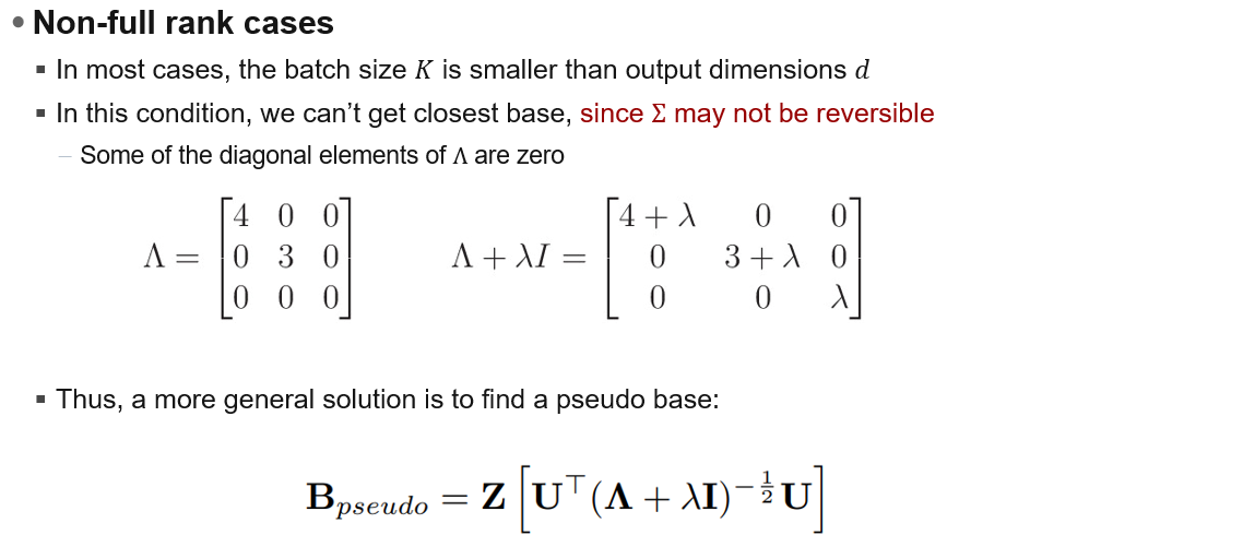 이러한 case를 나타내 주는것이 위의 그림이다. 왼쪽 행렬처럼 full rank가 아닐경우 대각 성분 중 0이 존재하게 된다. 이 경우 역행렬을 구할 수 없는데 논문에서는 λI를 더해주어 psuedo base를 구하는 technique을 사용하였다.