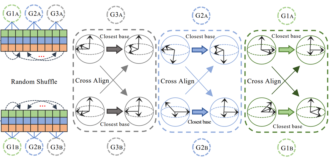 이 문제를 일부 완화하기 위해 차원을 random으로 shuffle하는 전략을 선택한다. 만약 shuffle하지 않고 고정된다면 G1A, G2A 두 집단의 각도는 항상 orthogonal하지 않은 방향으로 학습될 것이다. 하지만 학습때마다 shuffle을 하면 모든 dimension측면에서 orthogonal하도록 보완할 수 있다.