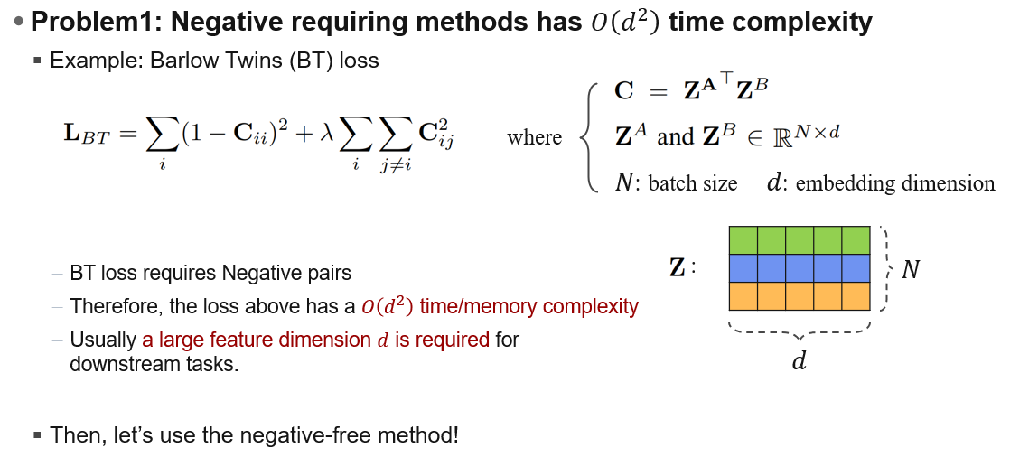 첫 번째 문제는 Negative requiring methods의 경우, 계산 복잡도가 O(d^2)라는 것이다(quadratic). 예시로 Barlow Twins method를 들 수 있다. Barlow Twin method는 위에서 설명했듯이 correlation matrix를 이용해 loss를 계산한다(위의 식에서 C가 correlation matrix). 따라서 backpropagation때 quadratic complexity를 가지게 된다. 이는 계산상의 비효율성 문제를 야기한다.
