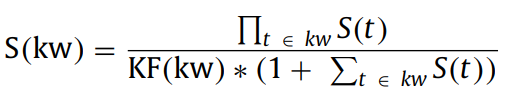 - 이제 다음과 같은 score function을 통해 score를 계산한다. kw는 하나 이상의 용어로 구성된 후보 키워드이다. S(KW)는 최종 점수이다.