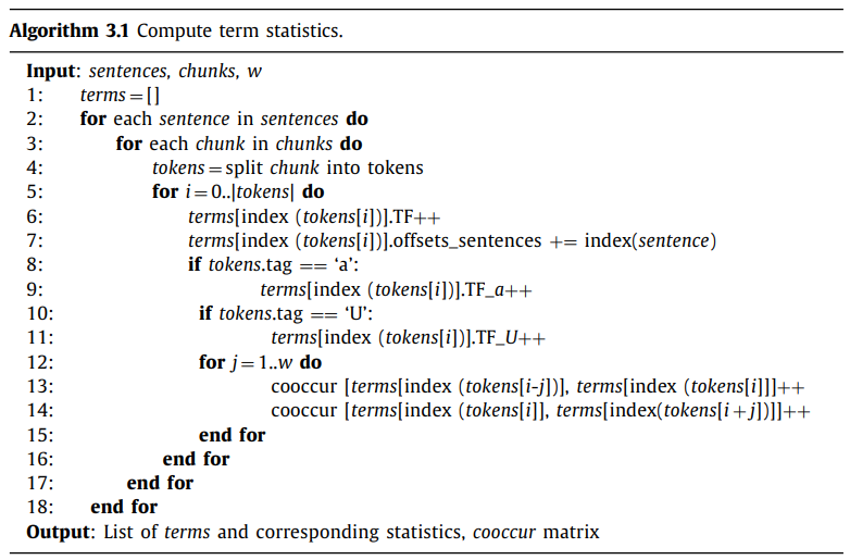 - Unsupervised method: 우리는 단일 문서에서 추출된 로컬 텍스트 통계적 특징을 기반으로 하는 light-weigth unsupervised keyword extraction model을 제안. 즉, 훈련 코퍼스가 필요 없음