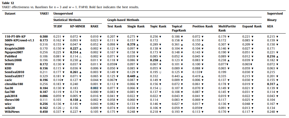 - Interior stopwords: YAKE!는 stop words(ex “game of Thrones”)가 포함된 키워드를 기존의 최신 방법들보다 높은 정확도로 추출