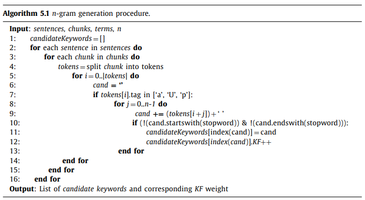 - feature를 이용해 용어의 importance를 반영하는 점수 생성 - n-gram generation and computing candidate keyword score