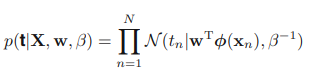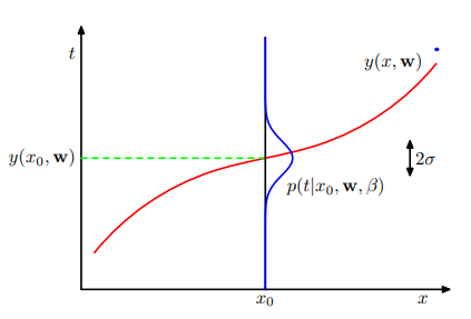 이전 글에서 직선 피팅 예시를 통해 베이지안 선형 회귀의 학습 방법을 알아 보았다. 베이지안 선형 회귀 - 직선 피팅 예시 (tistory.com) 베이지안 선형 회귀 - 직선 피팅 예시 선형 회귀 파라미터 최적화 - 최대 가능도 (tistory.com) 선형 회귀 파라미터 최적화 - 최대 가능도 선형 회귀의 파라미터 w를 최적화하기 위해 최대 가능도 방법을 이용해보자. 최대가능도를 이용한 mldiary.tistory.com 여기서는 w의 값을 알아내기 위해 학습을 반복했는데 실제 상황에서는 결국 새로운 x값에 대해 t의 값을 예측하는 것이 목표이다. 이를 위해서는 다음과 같이 정의되는 예측 분포(predictive distribution)를 고려해야 한다. t는 훈련 데이터로으로 이루어진 벡터이다. 이..