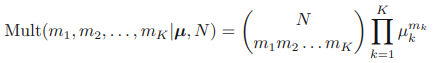 베타 분포 베타 분포 베르누이 분포, 이항 분포 이산 확률 변수 - 베르누이 분포, 이항 분포 베르누이 분포 동전 던지기 이진 확률 변수 x ∈ {0,1}을 고려해 보자. x=0은 뒷면, x=1은 앞면이다. 동전이 망가져서 앞면, 뒷 mldiary.tistory.com 이항 분포에서 사전 분포를 도입하기 위해 켤레성을 가지게 하는 베타 분포에 대해 알아보았다. 여기서는 이항 분포가 아닌 다항 분포에서 사전 분포를 도입하기 위해 켤레성을 가지게 하는 디리클레 분포에 대해 알아보자. (사전 분포를 도입하는 이유는 위의 글에서 설명했듯이 베이지안 접근법을 이용하여 불확실성을 표현하고자 하기 때문이다.) 다항 분포의 매개변수 {µk}에 대해 살펴보자. 다항 분포의 형태를 살펴보면 켤레성을 띄기 위해 사전 분포가..